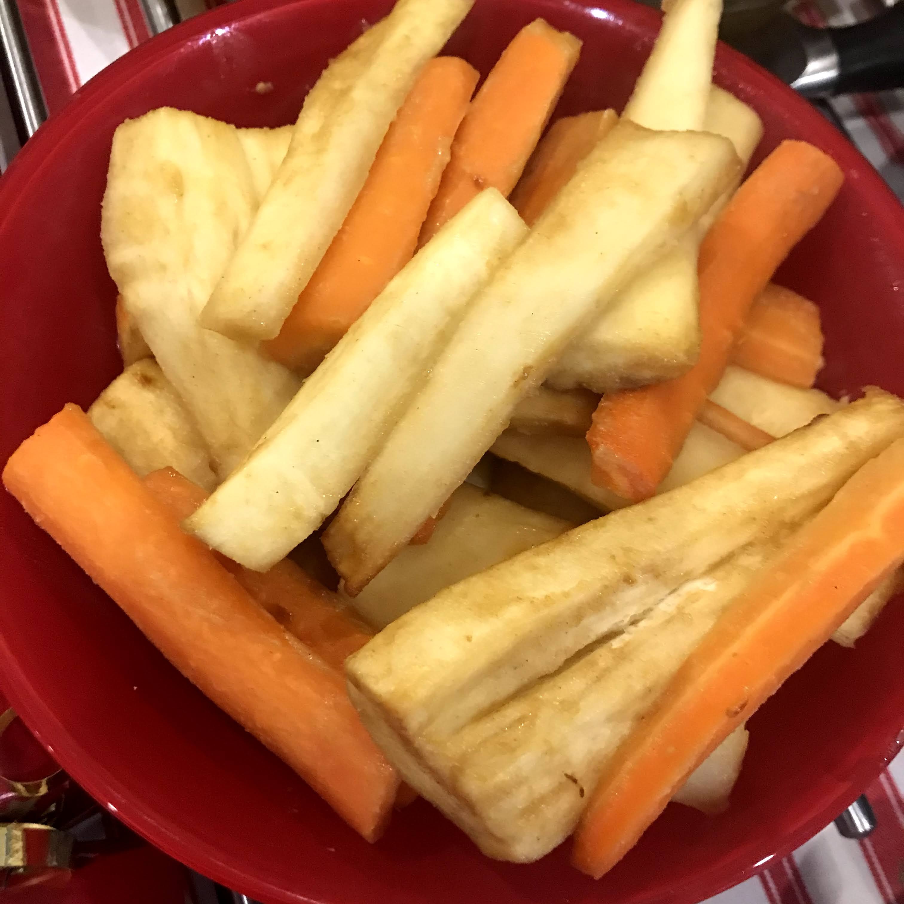 - Now trim and tail parsnip. Peel them and cut in half to make it easier to handle.