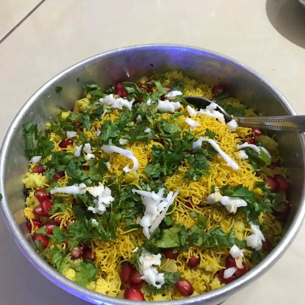 - Now transfer in a bowl. Now need to make layer of coconut then another layer of sev. Next layer of pomegranate and finally fresh coriander.
