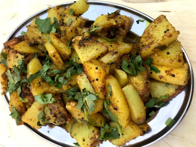 - Now add all spices except garam masala and sliced potatoes to the wok and stir everything well to make sure all potatoes are coated well with all spices.